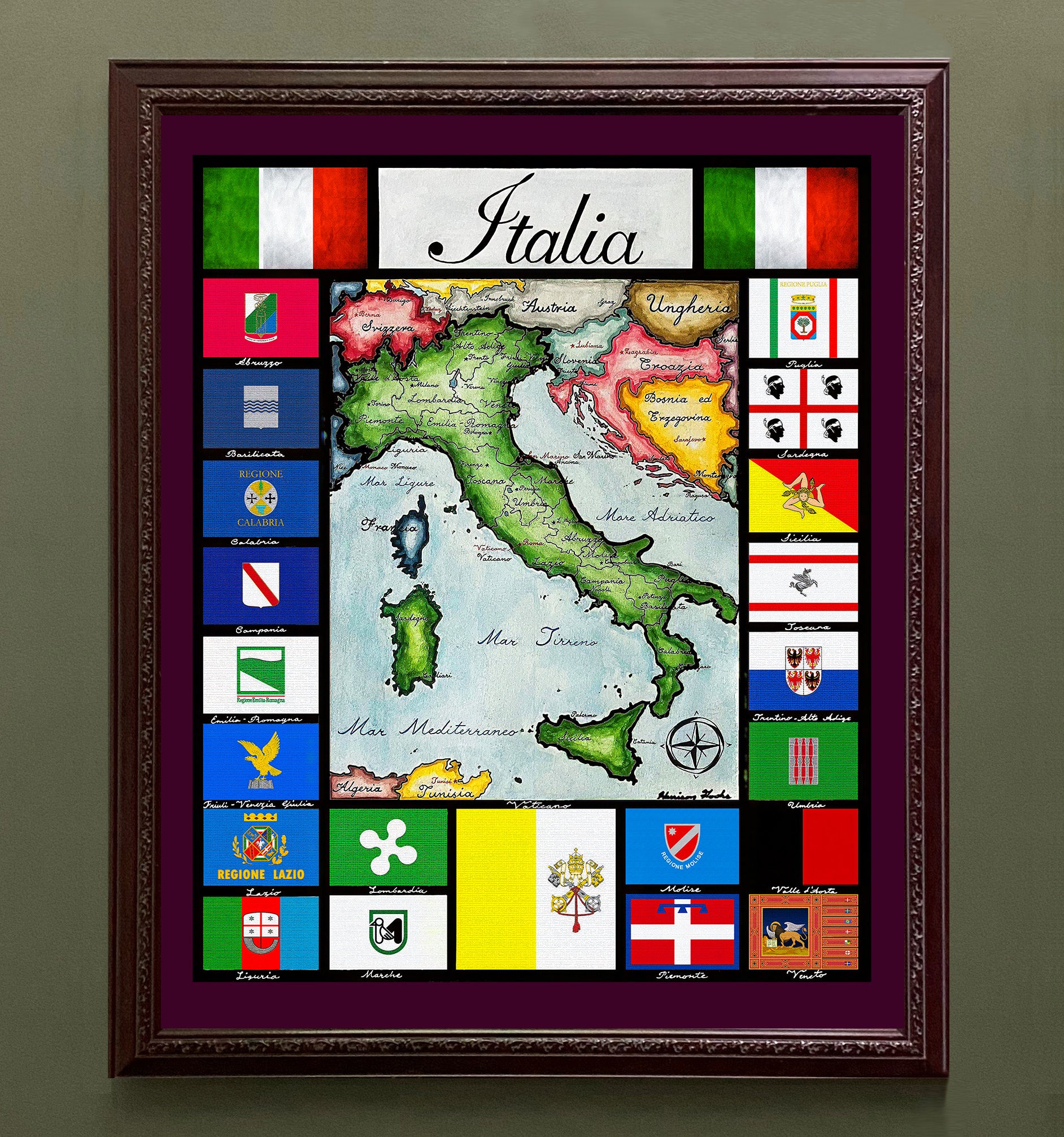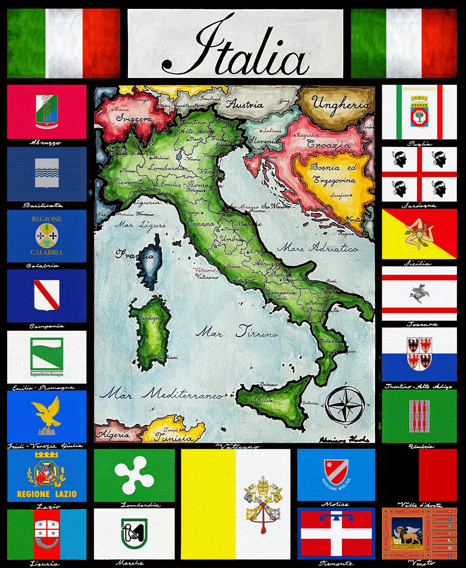 Handpainted map of contemporary Italy, depicting the Italian peninsula and surrounding regions with provincial and regional divisions labeled in Italian. The map is framed by the flags and heraldry of Italy’s regions, as well as the Italian tricolore and the flag of Vatican City. Geographic names, seas, and cities are written entirely in Italian.