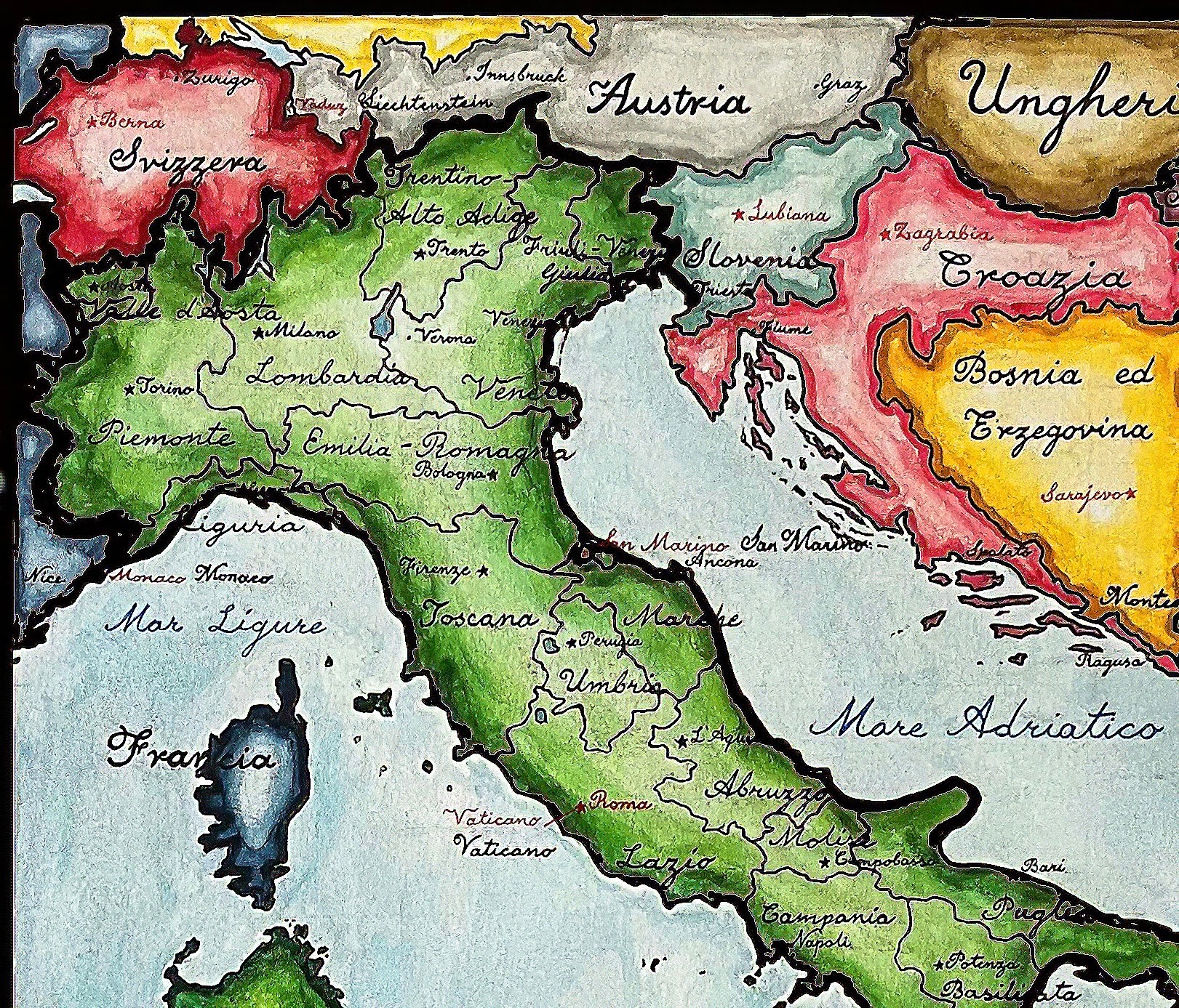 Italia; Handpainted map of contemporary Italy; Italy Map