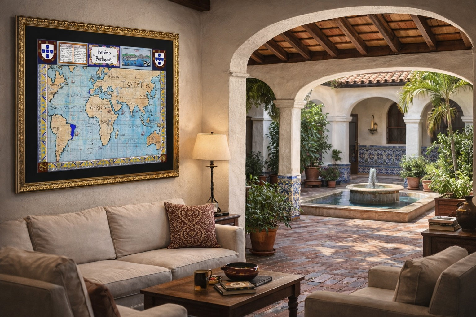 The result is a historically grounded visual interpretation of Portugal’s global maritime empire at its structural height — a network defined less by contiguous territory than by fortified ports, trade corridors, and navigational mastery.